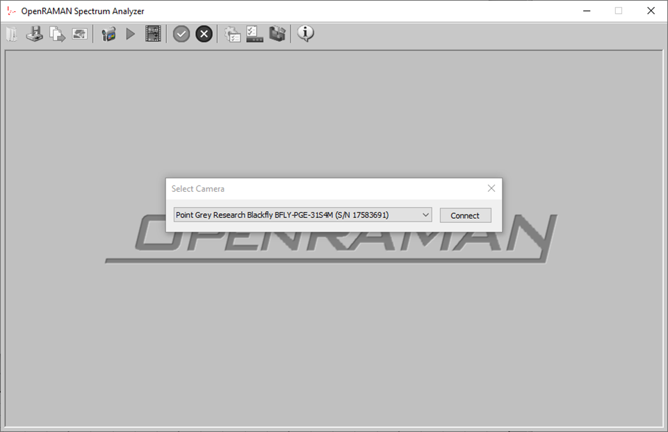 To connect to a spectrometer, click on the connect button. A popup will ask you to select the camera you will want to connect to. If you receive the error message that no camera has been found, check the IP settings of the camera if it is of GiGe type (see troubleshooting #8.1/).