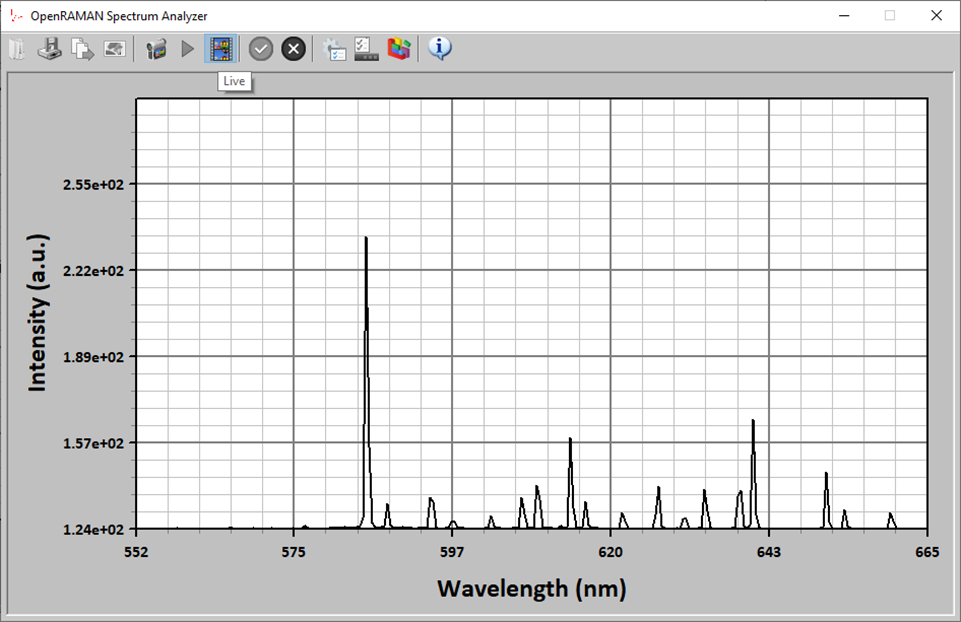 Live capture will usually be necessary when aligning the spectrometer. Some of the functionalities are disabled in the live capture mode. When exiting the live capture mode, the last spectra will be kept and you will be granted the same settings access as when using the single capture action.