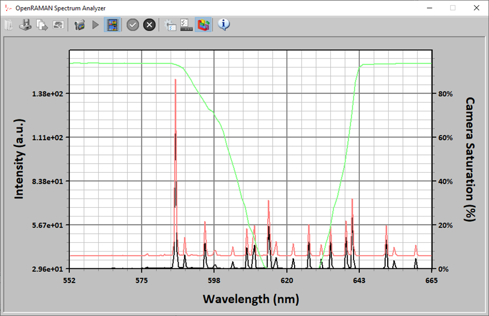 The “show saturation” option in the toolbar allows you to visualize the saturation and the centering of the camera sensor. The option is available for both single acquisition and live mode but is best used in live mode to tweak the exposure and gain settings.