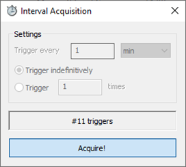 Then, parameter the Interval.exe program for the delay and number of repetitions that you would like. Press the “Acquire!” button to start acquisition and press again to stop the acquisition.