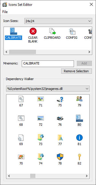 To change the toolbar icons, open the toolbar.iis file in the Spectrum Analyzer source code folder using the Icons Set Editor program. The program will list all the icons by their mnemonics and let you replace the current icon by selecting them from a list in the dependency walker window. Once you have modified all the icons, save the file by overwriting the toolbar.iis file and recompile the Spectrum Analyzer program.