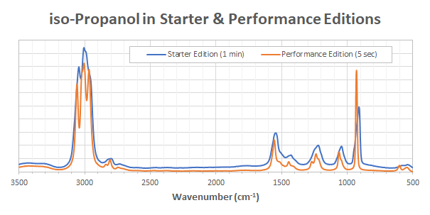 Figure 1 compares the performances of the base spectrometer vs. upgraded spectrometer for an iso-propanol spectrum. You can see that all the important features are clearly identified although the upgraded spectrometer obviously has better resolution and better SNR.