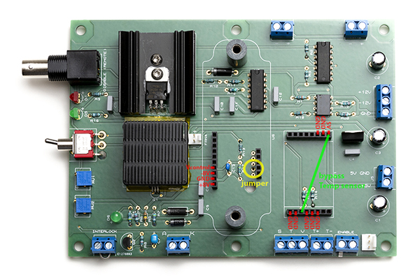 Add a jumper wire to the interlock and connect the key switch to the enable header blocks. Add a jumper wire to bypass the MTD415TE as shown in green in the previous picture.