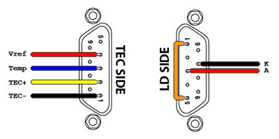 Before you can test your laser, you will have to wire it to the LDM21 using SUB-D9 connectors. I recommend using 18AWG cables for all power lines and a twisted/shielded pair to connect the temperature sensing part. The circuit has a “shield” connection port to connect the bread of the shield. The cable shield must be connected on one side only (circuit-side).